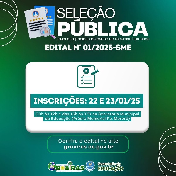 O edital está disponível no site oficial da Prefeitura de Groaíras (www.groairas.ce.gov.br) e na sede da Secretaria Municipal da Educação, localizada na Rua João Guarino Feijão, nº 722, Bairro Chico Jeronimo.